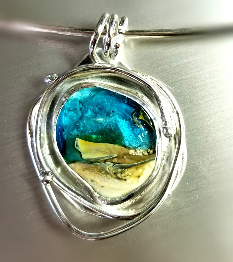 Fine silver and sterling encase a hand made glass cabochon containing the ashes or hair of your passed on loved one or pet. Ashes are seen but hair will not be visible. The glass portion is 1-1/4″ and the entire piece measures about 2″-2 1/2″. Each one is unique so slight variations happen. This glass is the ocean toned theme with the appearance of the ocean encapsulating the ash or hair. Pieces are able to be polished and tumbled as another silver jewelry. Chains and neckwires sold separately. After you complete your transaction, we will send you a packet with instructions to collect your ashes or hair.