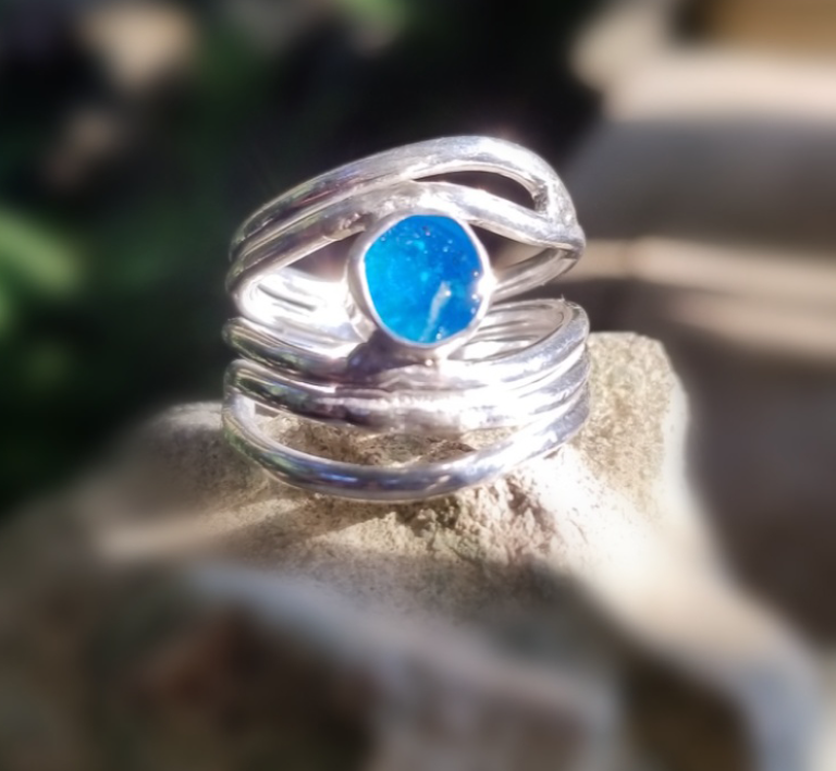 Kiln fired glass in blue colors with encases a hand made glass cabochon containing the ashes or hair of your passed on loved one or pet. Ashes are seen but hair will not be visible. The glass portion is 4-6mm round shape bezel set in 14 gauge fine silver. It measures about 3/4″ – 1″ above and 1/2″ thick under your finger. These rings have a lower profile are stunning in the sun light. Each one is unique so slight variations happen. Pieces are able to be polished and tumbled as other silver jewelry. After you complete your transaction we will send you a packet with instructions to collect your ashes or hair.