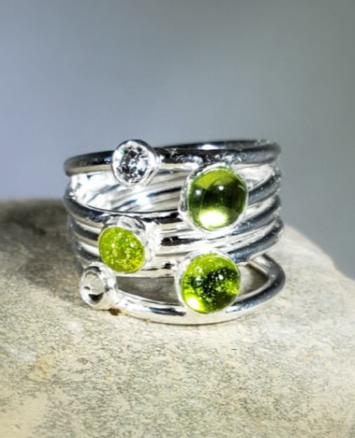 Kiln fired glass in brilliant green color encases 2 hand made glass cabochon containing the ashes or hair of your passed on loved one or pet. Ashes are seen but hair will not be visible. The peridot stone 5mm, sparkling 4mm gem and two 4-6mm glass cabochons are round shapes bezel set with five strands of 12 gauge fine silver. These rings have a lower profile are stunning in the sun light. Each one is unique so slight variations happen. Pieces are able to be polished and tumbled as other silver jewelry. After you complete your transaction, we will send you a packet with instructions to collect your ashes or hair.