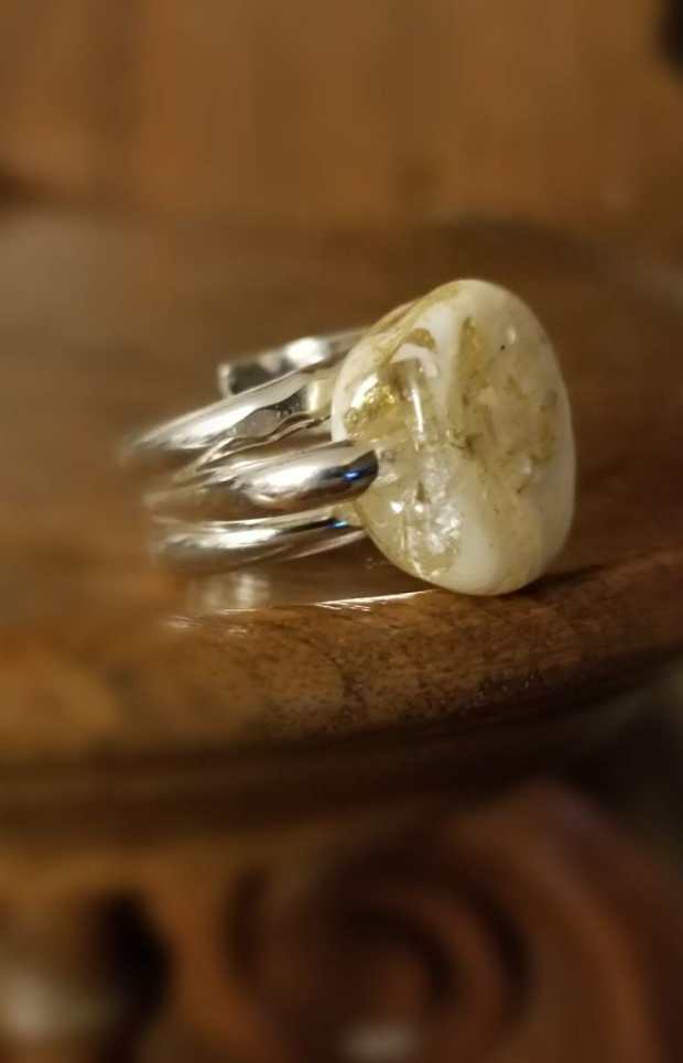 Torch fired glass in creamy and clear colors with gold foils encases a hand made glass cabochon containing the ashes or hair of your passed on loved one or pet. Ashes are seen but hair will not be visible. The glass portion is about a 1/2″ by about 3/4 ” mounted on sterling silver wire that is adjustable. These rings have a high profile and are stunning in the sun light. Each one is unique so slight variations happen.  Pieces are able to be polished and tumbled as other silver jewelry.  After you complete your transaction we will send you a packet with instructions to collect your ashes or hair.